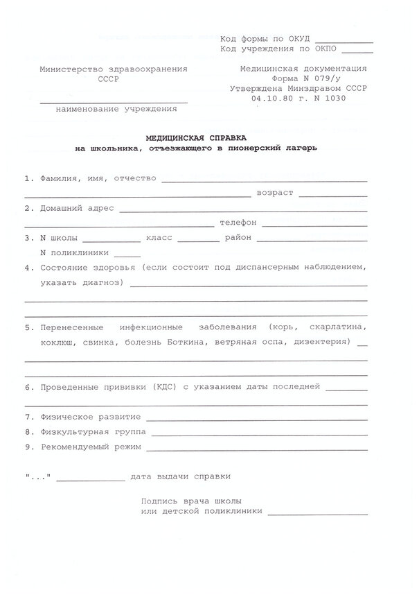 В справке в лагерь формы 079/у содержится следующая информация:
