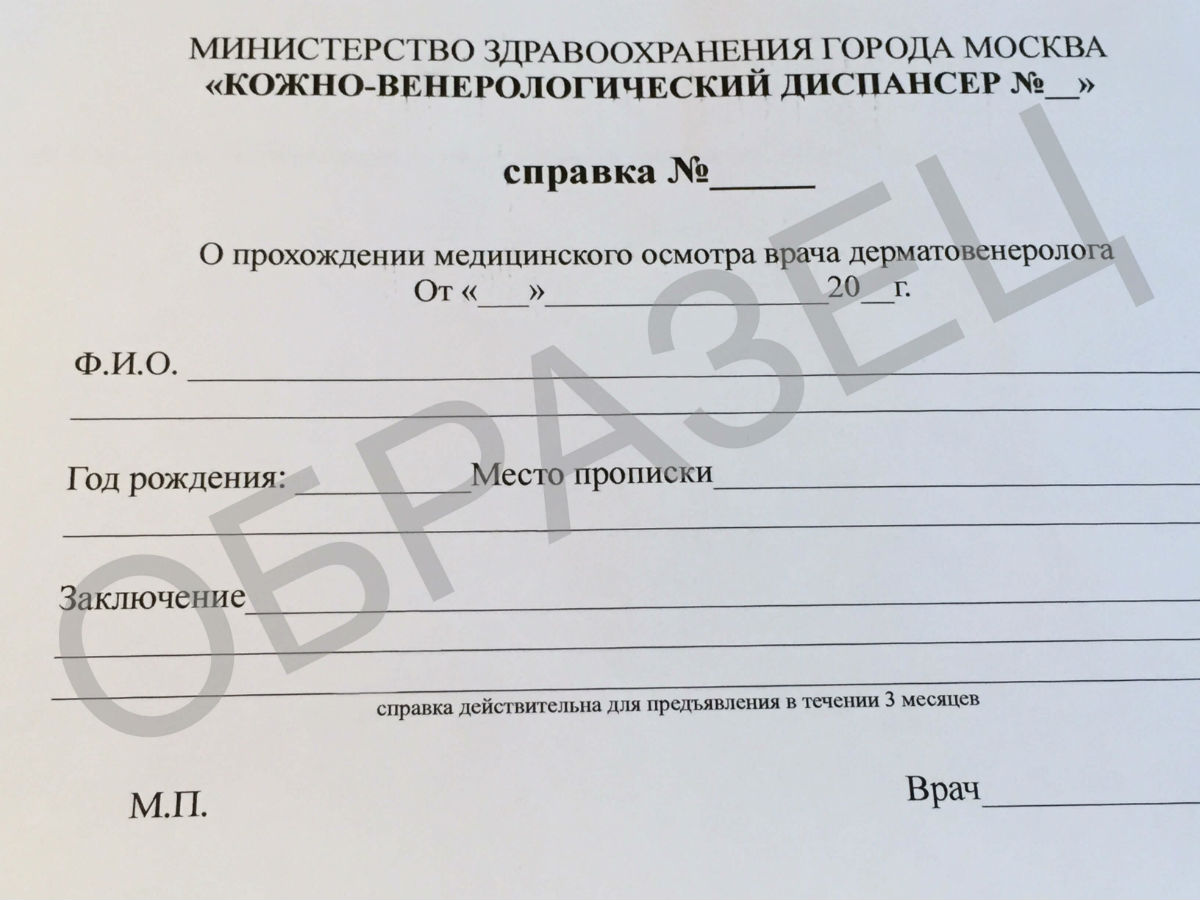 Справка из кожно-венерологического диспансера – это официальное медицинское заключение, которое является подтверждением отсутствия у человека кожных и венерических заболеваний, инфекций, которые передаются половым путем или через кровь. В документе указывается, что пациент здоров на момент обращения. При обнаружении у него гепатита, ВИЧ или других заболеваний, эта информация отображается в справку. Для получения бланка необходимо обратиться в государственный диспансер по месту жительства. Предварительно понадобится сдача крови, проведение осмотра и обследования.