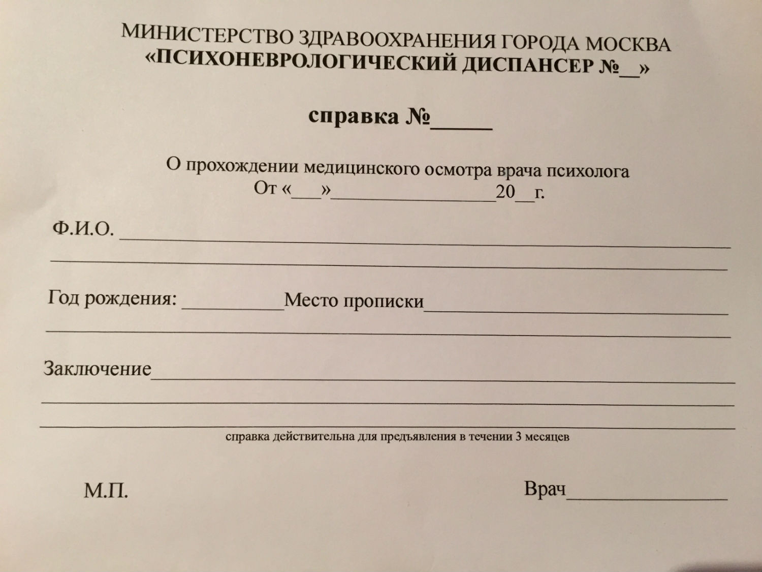 Чтобы получить справку из психоневрологического диспансера в Москве, нужно обратиться в учреждение по месту прописки, взяв с собой паспорт. В некоторых случаях нужно иметь при себе полис обязательного медицинского страхования и военный билет. Перед личным посещением диспансера рекомендуем вам уточнить по телефону порядок выдачи медицинских заключений и список документов, которые для этого необходимы.
